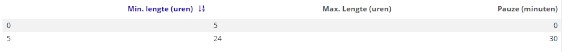 - Min. lengte; dit is de minimale lengte (in uren) van de dienst waarbij de pauzeregel moet worden toegepast.
